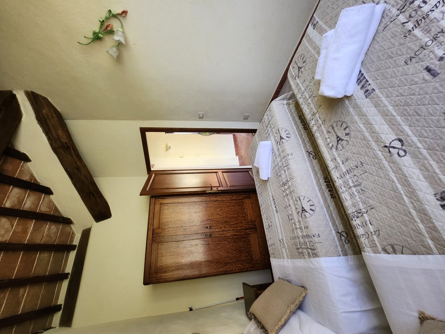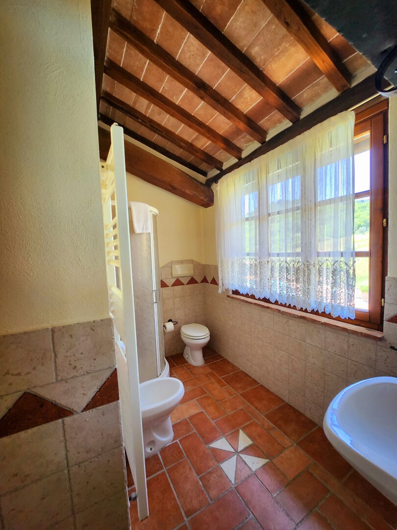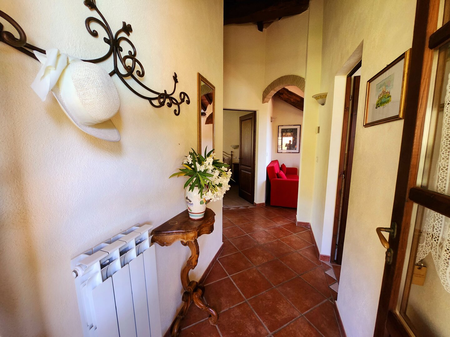 Located on the first floor this comfortbale verylight large apartment has a small balcony in the front of the entrace and a big furnitured private terrace with amazing view on the hils and Volterra , comprises of: